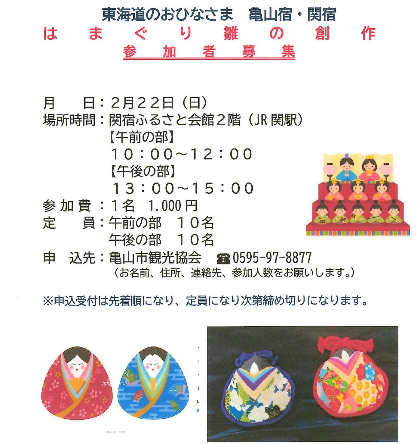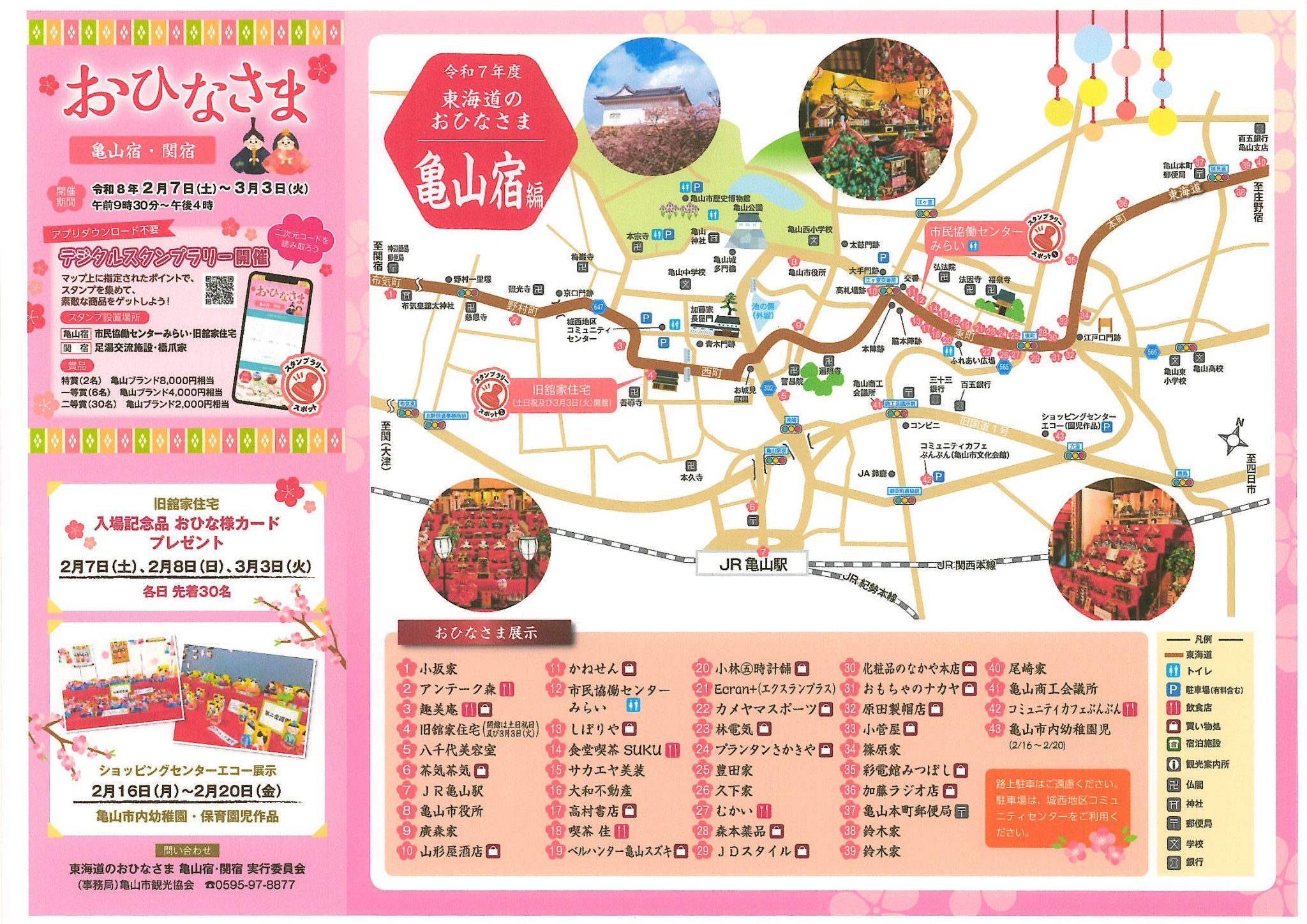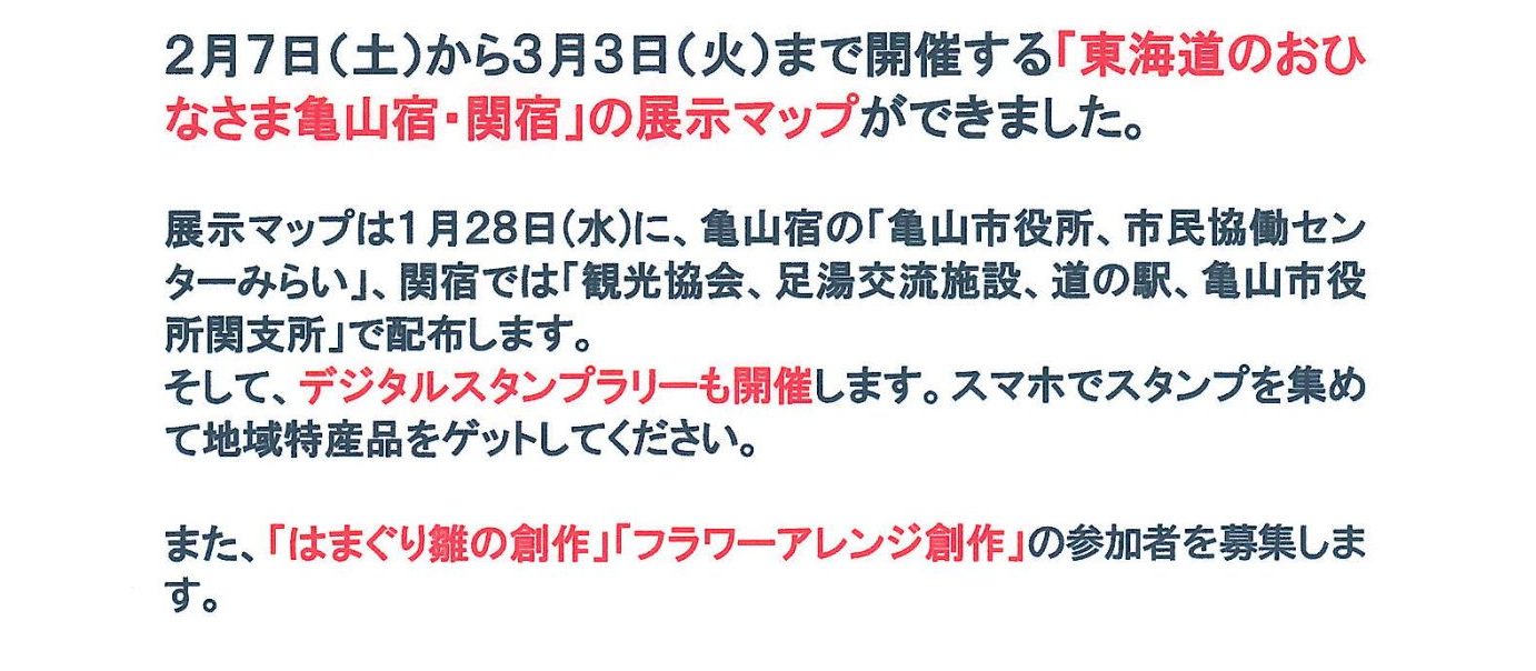 「東海道のおひなさま亀山宿・関宿」のマップができました。 公開済み: 2026年1月28日更新: 2026年1月28日作成者: kameyamaカテゴリー: お知らせ, 亀山宿, 祭り, 関宿 この投稿へのトラックバック トラックバックはありません。 トラックバック URL