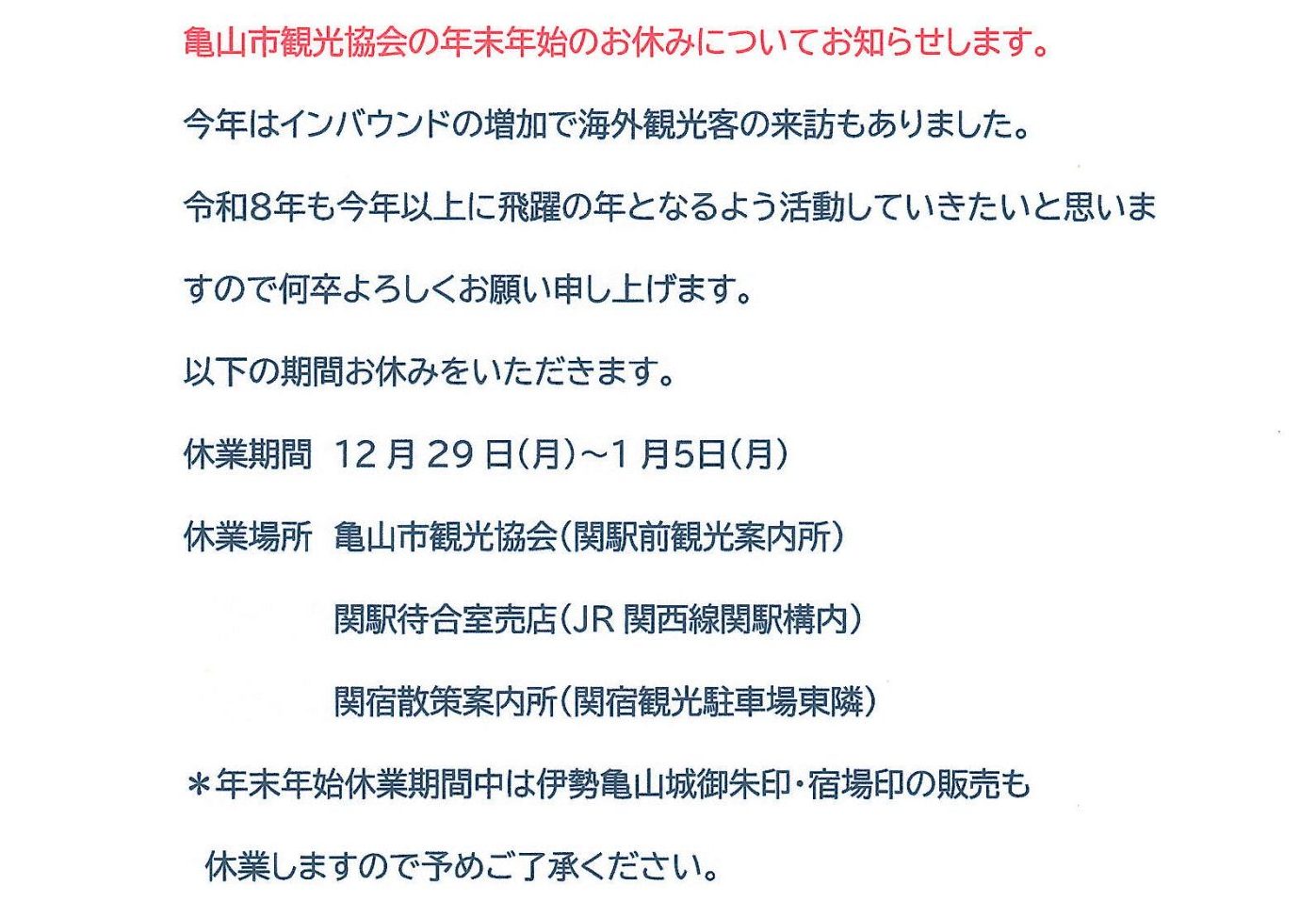 亀山市観光協会「関駅案内所」及び「足湯関宿散策案内施設」の年末年始の営業は下記の通りとなります。 年内最終 12月28日(水)8:30~17:00 休 業 12月29日(木)~1月3日(火) 年始営業 1月4日(水)8 […]