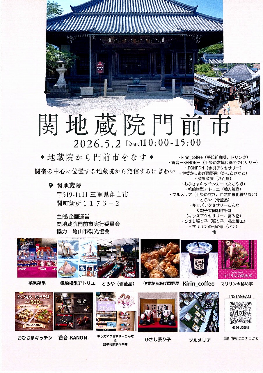 関地蔵院門前市を5月2日開催します。 公開済み: 2026年4月15日更新: 2026年4月15日作成者: kameyamaカテゴリー: お知らせ, 関宿 関連記事 09 地蔵院伝来歴史資料展「関地蔵町と地蔵院」を1月11日(土)~13日(月)に開催します。 公開済み: 2025年1月9日更新: 2025年1月10日作成者: kameyamaカテゴリー: お知らせ, 関宿 05 関地蔵院で絵手紙の展示を5月15日~17日まで開催します。 公開済み: 2025年5月5日更新: 2025年5月5日作成者: kameyamaカテゴリー: お知らせ, 関宿 関宿祇園夏まつりを7月19日、20日に開催します。 夏の風物詩である関宿祇園夏まつりを7月19日(土)、7月20日(日)に開催します。 公開済み: 2025年6月17日更新: 2025年6月17日作成者: kameyamaカテゴリー: お知らせ, 関宿 この投稿へのトラックバック トラックバックはありません。 トラックバック URL