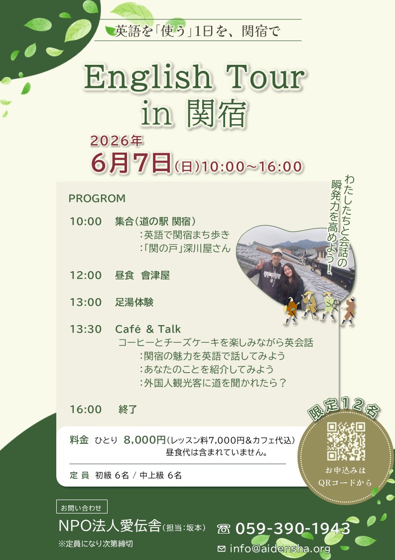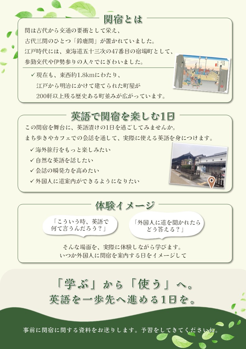 English Tour in 関宿の参加者募集について 公開済み: 2026年4月16日更新: 2026年4月16日作成者: kameyamaカテゴリー: お知らせ, 楽しむ, 関宿 2026年6月7日(日曜日)に開催されるEnglish Tour in 関宿の参加者募集が始まりました。 ゆったり関宿を歩きながら、日常英会話を気軽に楽しむツアーです。 英語初心者の方も、中上級の方も、レベル別で安心してご参加いただけます。 詳しくは下段の主催者チラシをご覧ください。 関連記事 19 🍊 冬至限定・小満の湯「ゆず足湯」のご案内 亀山市観光協会では冬至に合わせ、関宿観光駐車場に隣接する足湯施設「小満の湯」に、ゆずを浮かべた特別な足湯をご用意しました。 期間:12月19日(金)~12月21日(日) 時間:毎日10時~16時 関宿の町並みを散策した後 […] 公開済み: 2025年12月19日更新: 2025年12月19日作成者: kameyamaカテゴリー: お知らせ, エリア, ジャンル, ブログ, 季節, 楽しむ, 関宿 関宿ひなまつり落語を3月2日(日)に開催します。 関宿ひなまつり落語を関地蔵院で3月2日(日)午前10時30分から開催します。(入場無料) 公開済み: 2025年2月20日更新: 2025年2月20日作成者: kameyamaカテゴリー: お知らせ, 楽しむ, 関宿 23 毎日放送テレビ番組「土曜のあさはほめるちゃん」とコラボした沿線謎解き周遊企画を実施します この度、JR関西線の観光面での利用促進を図ることを目的として、毎日放送のテレビ番組「土曜のあさはほめるちゃん」とコラボした沿線周遊企画を以下のとおり実施します。 1 周遊企画の概要 伊賀鉄道上野市駅周辺の「伊賀上野エ […] 公開済み: 2025年12月23日更新: 2025年12月23日作成者: kameyamaカテゴリー: お知らせ, ブログ, 楽しむ, 関宿 この投稿へのトラックバック トラックバックはありません。 トラックバック URL